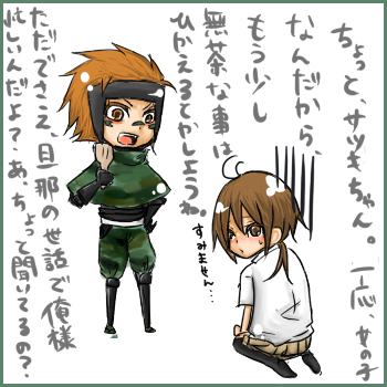 ということで今回のチビ絵はこまっちリクの佐助と皐月でございまぁーす!キャラリクだけだったので、おかんに怒られるの図。